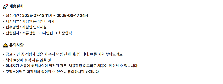 - 지원 링크: https://www.saramin.co.kr/zf_user/jobs/relay/view?isMypage=no&rec_idx=51333835&recommend_ids=eJxNzMkNwEAIQ9FqcscsBs4pJP13kaCRZnLj6QsH4JTop4Ar7xgGh7JIKO1UNSc2zcwRm5qqmZvSrPJTTQRnSlvIX1U29fziW56pWpX2ncMXJqQl7w%3D%3D&view_type=list&gz=1&t_ref_content=ing_intro&t_ref=company_info_view&relayNonce=42d0416c1fb43f3b35e1&immediately_apply_layer_open=n#seq=0