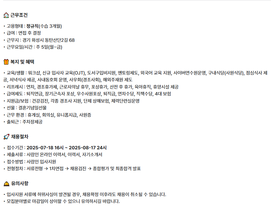 - 지원 링크: https://www.saramin.co.kr/zf_user/jobs/relay/view?isMypage=no&rec_idx=51337799&recommend_ids=eJxVjskNA0EQAqPxv4Hp6%2B1AnH8WXu1a0%2BNnCVTgEGHZn4K98u3ACnRdiBtlAcNOBSUG6ZLZLtPZ4kZLeedGUCz9YfQMEVqzi%2FasUWn5c%2BM3VJ6IKcfVx4k6kFyVOlWmecVkAccN91iHivA7%2FQLauz9o&view_type=list&gz=1&t_ref_content=ing_recruit&t_ref=company_info_view&relayNonce=6f2ab733612febd987a7&immediately_apply_layer_open=n#seq=0