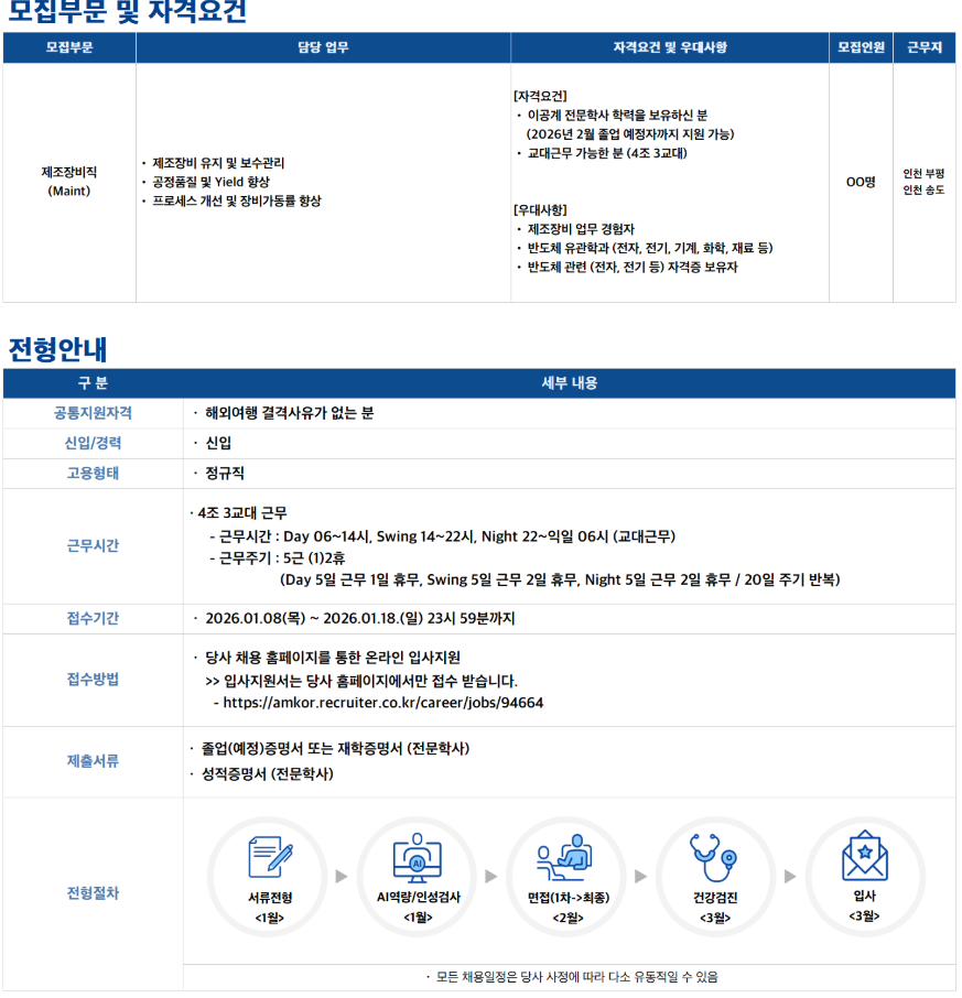 지원 링크: https://amkor.recruiter.co.kr/career/jobs/94664