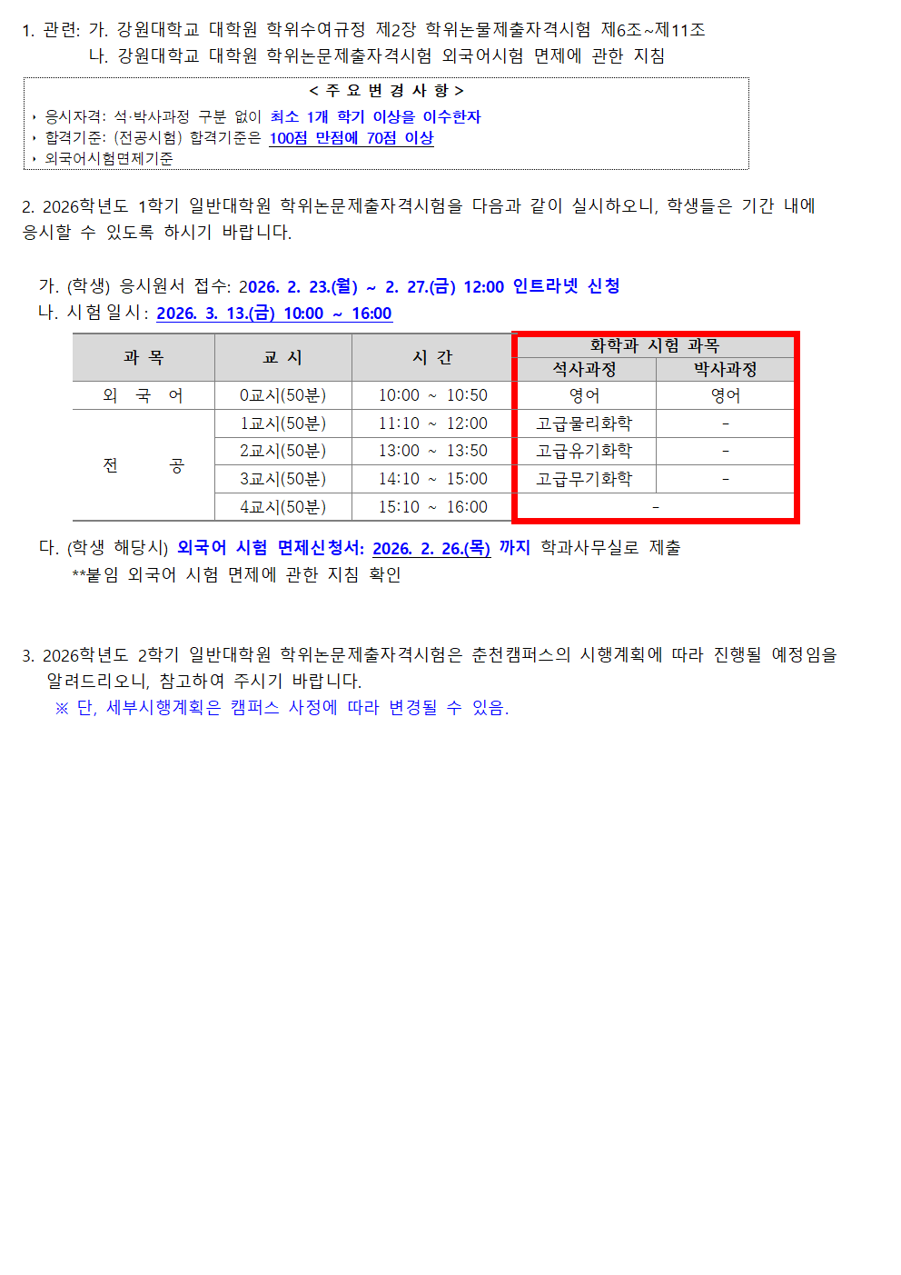 [대학원] 2026학년도 1학기 일반대학원 학위논문제출자격시험 실시 안내