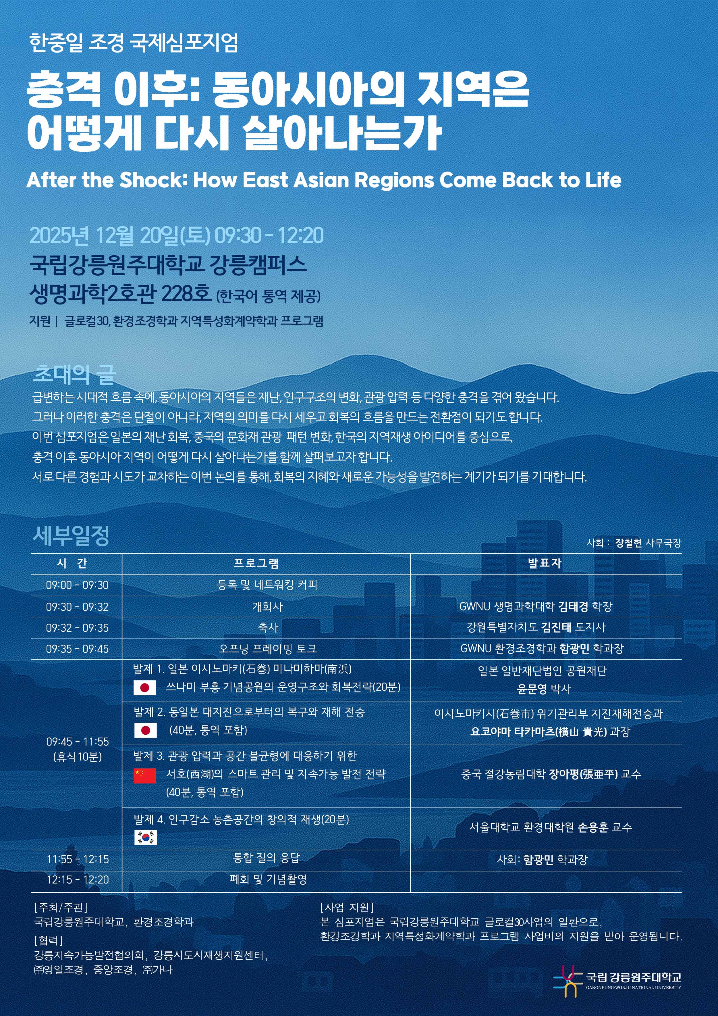국립강릉원주대학교 환경조경학과에서는 20251220() 강릉캠퍼스 생명과학2호관 228호에서 동아시아 지역의 회복과 재생을 주제로 한 국제심포지움을 개최합니다.