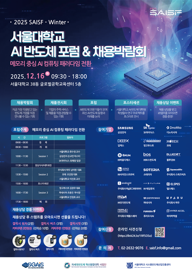 fnctId=bbs,fnctNo=1727 서울대학교 AI 반도체 포럼& 채용박람회 작성일 2025.12.10 작성자 김호진 조회수 348 → 온라인 사전신청 바로가기 첨부파일 첨부파일이(가) 없습니다.