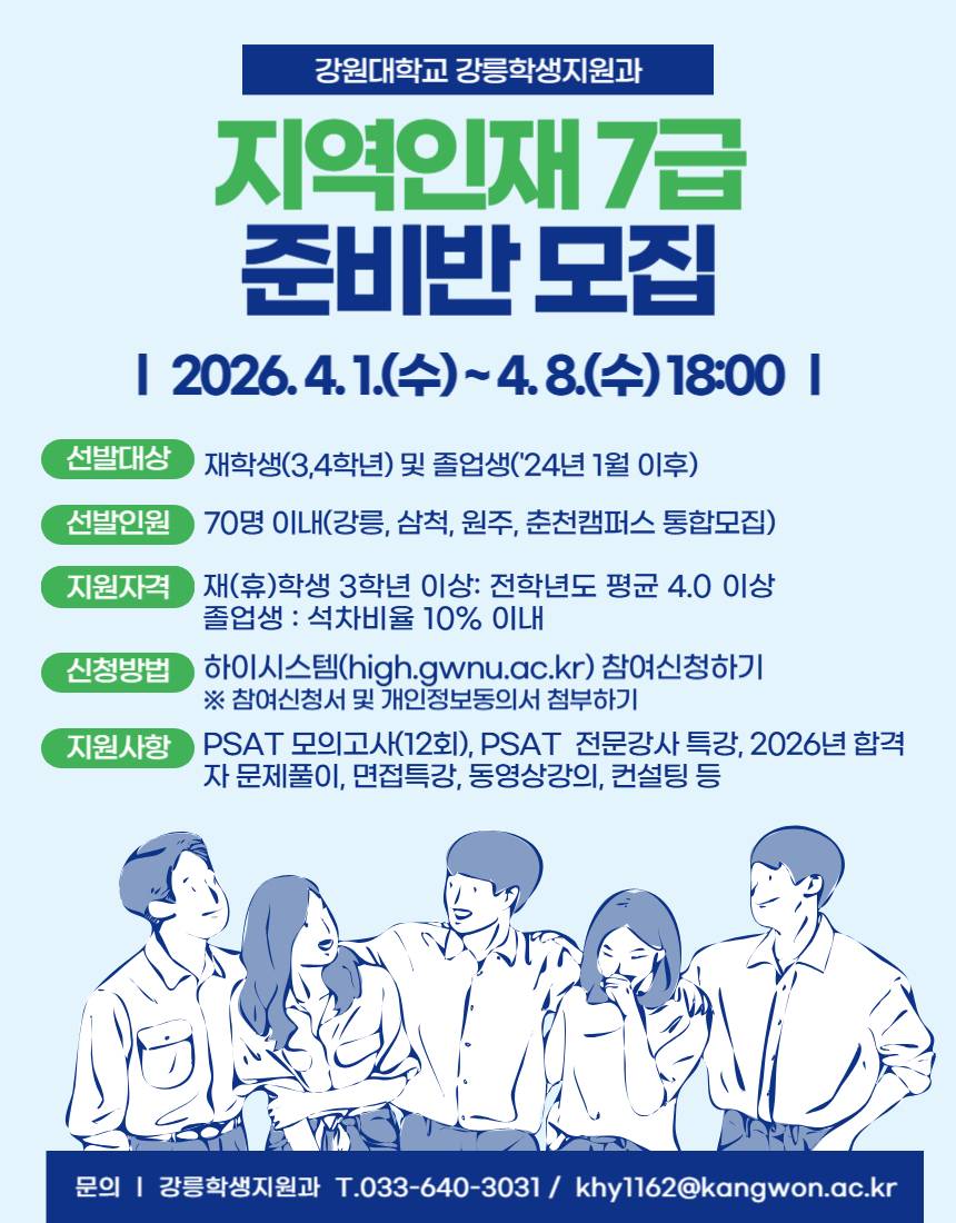 fnctId=bbs,fnctNo=642 2026학년도 강릉캠퍼스 지역인재7급 취업지원 프로그램 참여인원 모집 작성일 2026.04.01 작성자 노종민 조회수 51 첨부파일 붙임1_참가 신청서(서식).hwp 붙임2_개인정보 제공 동의서.hwp