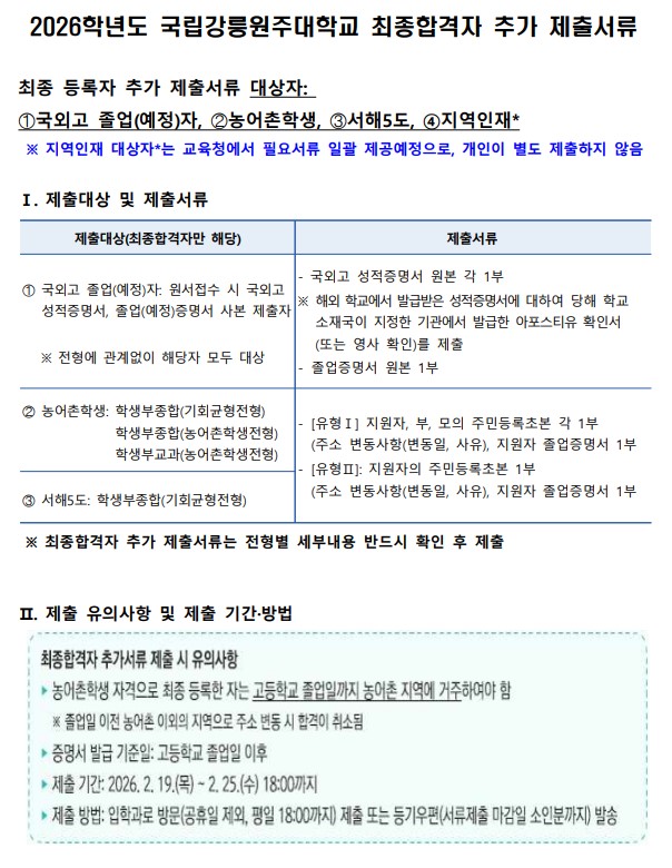 fnctId=bbs,fnctNo=1606 2026학년도 수시모집 최종합격자 추가 제출서류 안내 분류 수시모집 작성일 2026.02.04 작성자 박재원 조회수 2881 발송 주소지: [25457]강원특별자치도 강릉시 죽헌길 7 국립강릉원주대학교 입학과(대학본부C6, 1층 111호) 첨부파일 2026학년도 최종합격자 추가 제출서류.pdf